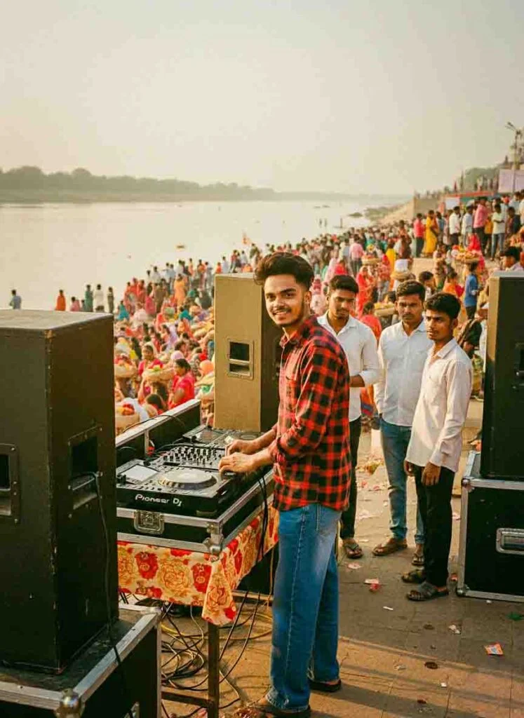 Create a realistic and visually captivating image that beautifully captures the essence of Chhath Puja celebrations at the riverbank. The scene should feature an 18-year-old village boy dressed in a black checked shirt and blue baggy jeans, representing the vibrant and youthful energy of rural life. He is setting up a large DJ sound system near the Chhath Ghat, preparing to play festive music as people gather to celebrate this sacred occasion. His expression is cheerful and genuine—he looks directly into the camera with a warm, welcoming smile that reflects his excitement and connection to the festival atmosphere.