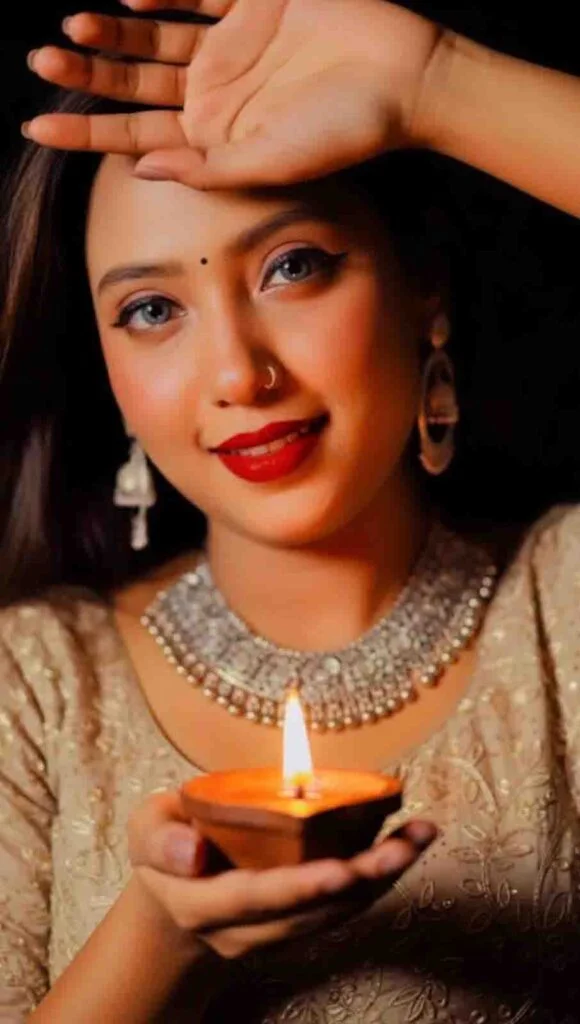 Diwali-themed diya photo editing is the process of digitally creating hyper-realistic portraits featuring a diya lamp, warm lighting, and traditional festive accessories, while preserving your face, hairstyle, and expression.