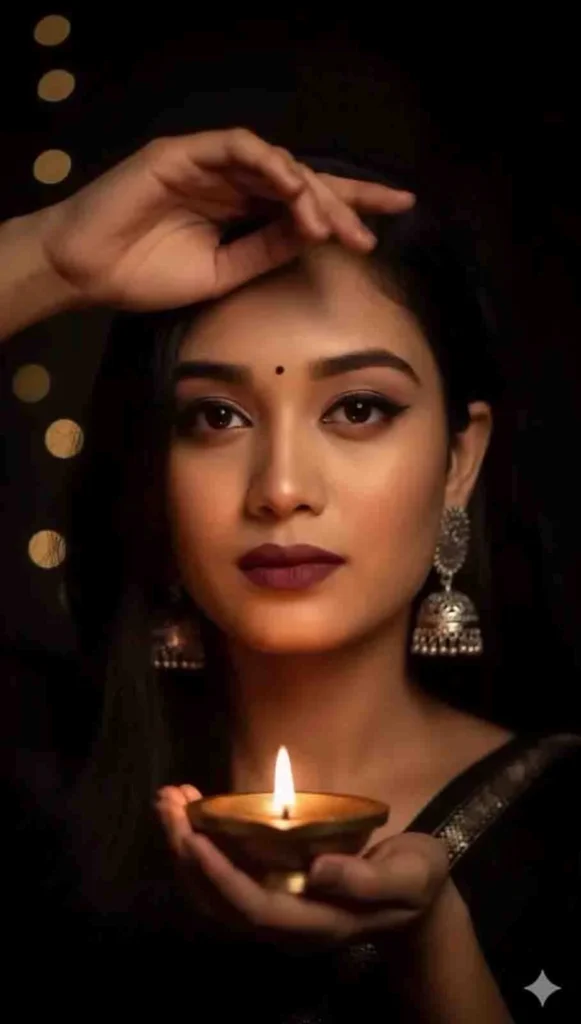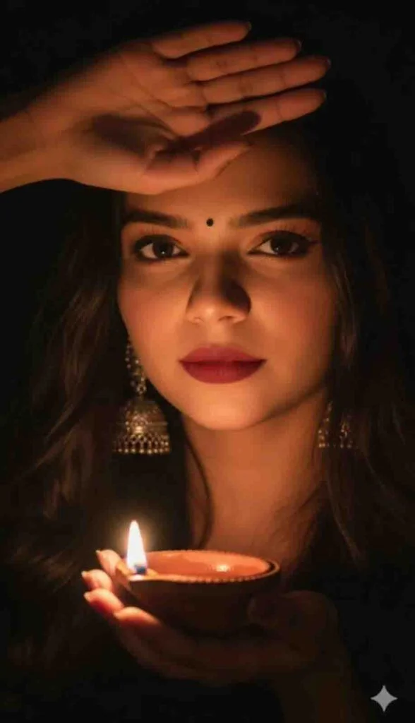 One of her hands is gently raised above her forehead, casting a subtle, artistic shadow, while the flame of the diya reflects delicately in her expressive eyes, adding depth, realism, and warmth.