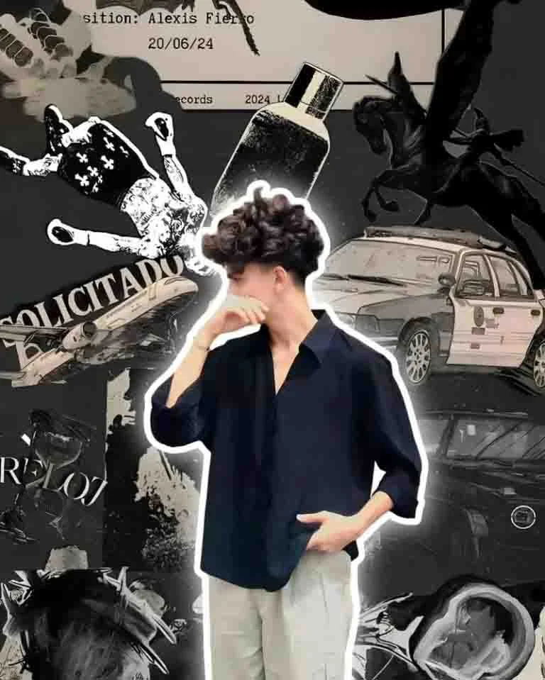 The background features an artistic black-and-gray collage, designed with a dark grunge aesthetic. This collage includes striking visual elements such as a police car, a mythical flying horse (Pegasus), a perfume bottle, newspaper clippings and text fragments, a record label, and various abstract paint textures. These elements blend together seamlessly, creating an atmospheric and visually rich backdrop that enhances the subject’s modern, edgy persona.