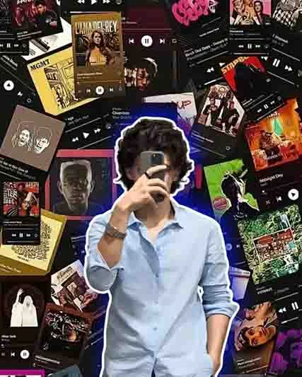 A young man is the central subject of a vibrant, music-themed collage portrait. He is dressed in a light blue, long-sleeved collared shirt, styled neatly, with a silver-toned watch or bracelet visible on his left wrist, adding a touch of sophistication. He holds a dark-cased smartphone directly in front of his face, completely obscuring his features, creating a modern and relatable selfie aesthetic.