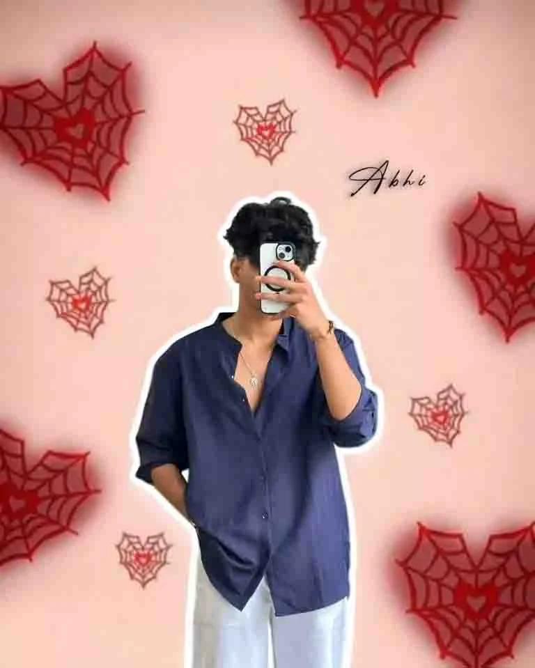A stylish young man taking a mirror selfie, wearing a navy blue loose shirt paired with white pants, complemented by minimal jewelry and curly hair. He is holding a phone in front of his face, creating a natural selfie pose. The background is a soft pastel pink, artistically decorated with small red spiderweb-shaped hearts to add a modern romantic aesthetic. Add a subtle soft shadow outline around the person for depth and focus. The name “Abhi” should appear elegantly on the side in a beautiful cursive font, blending naturally into the design. Maintain a clean, realistic portrait style with smooth lighting, balanced colors, and a trendy Instagram DP look — minimal yet eye-catching, with a polished, aesthetic finish.