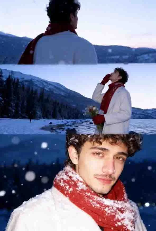 The overall aesthetic should be nostalgic and emotionally evocative, with a film-photo style reminiscent of classic cinematic photography. Utilize a 35mm depth of field to ensure a natural focus on the subject while softly blurring the background, emphasizing mood and atmosphere. This series should combine technical precision, artistic composition, and emotional storytelling, creating an ultra-realistic, visually captivating winter portrait suitable for social media, high-quality prints, or AI-generated cinematic presentations.
