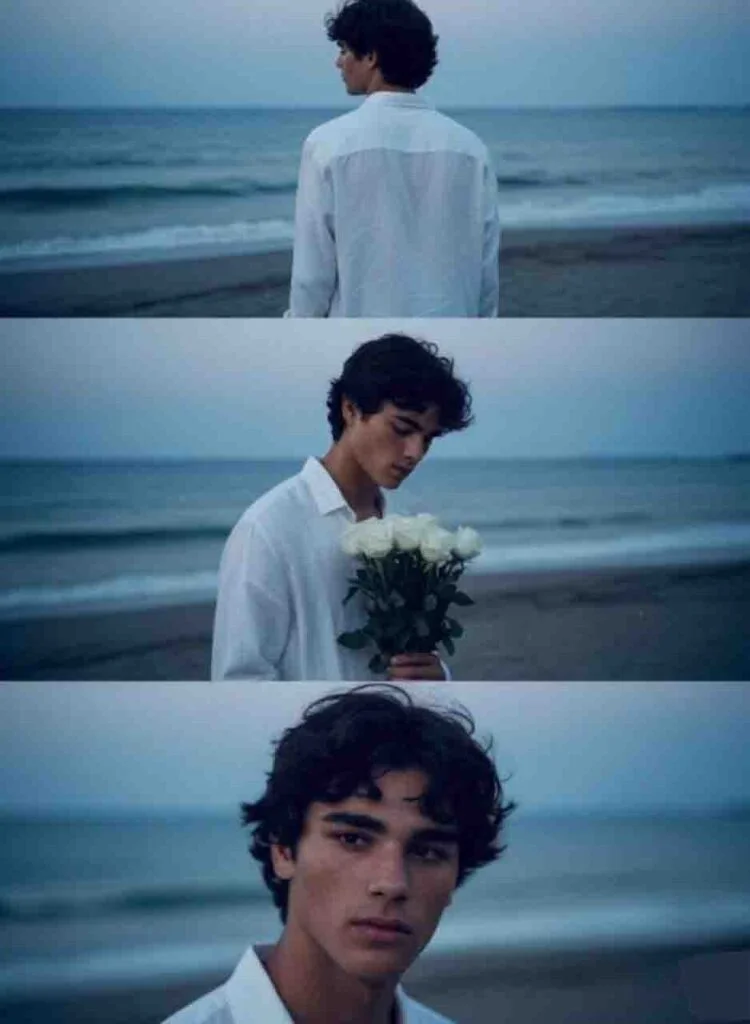The image should be composed as a single photo divided into three horizontal frames for a cinematic storytelling effect. The first frame captures the subject from behind, looking thoughtfully at the sea, creating a sense of introspection and tranquility. The second frame shows the person holding a bouquet of white flowers, looking down with a reflective and emotional expression. The third frame is an intimate close-up of the face, softly illuminated by subtle flash lighting to highlight delicate features while maintaining a natural, cinematic look.