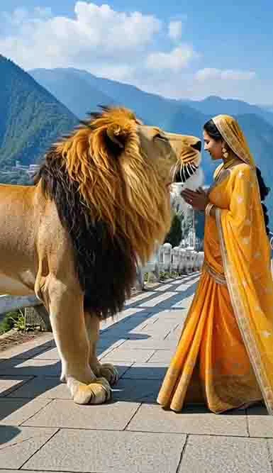 The girl begins running, and then a realistic lifelike lion approaches her. She stands near the lion and places her hands gently on its head, creating a visually dramatic and captivating moment. The scene should maintain lifelike details, realistic shadows, and natural interactions.