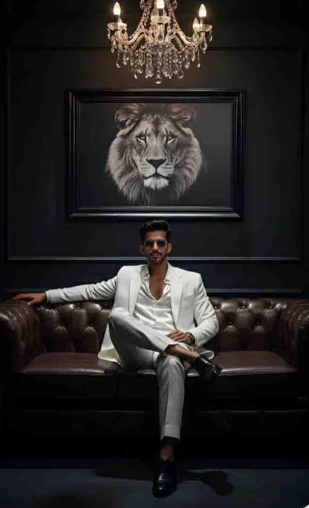 A chandelier hangs above, casting soft, ambient lighting that highlights the textures of the sofa, his clothing, and polished black leather shoes. He is dressed in a crisp white suit with a white shirt, with the top buttons casually undone, sitting in a relaxed pose with one leg crossed over the other, conveying both authority and ease.