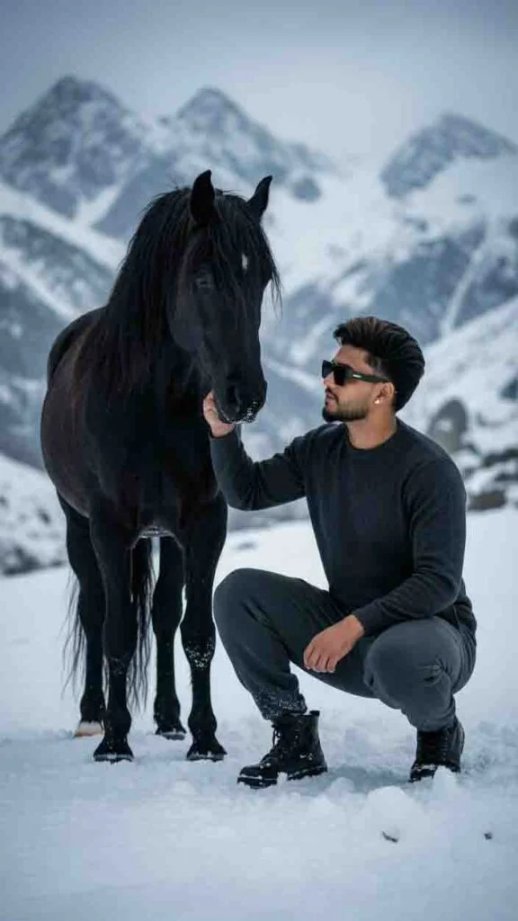 Create an ultra-realistic, 8K resolution cinematic image of a person crouching beside a powerful black horse in a snow-covered mountainous landscape. Ensure the facial features exactly match the uploaded reference image, keeping the face 100% accurate. The person has wavy hair and wears dark sunglasses, a cozy black sweater, grey cargo pants, and black boots.