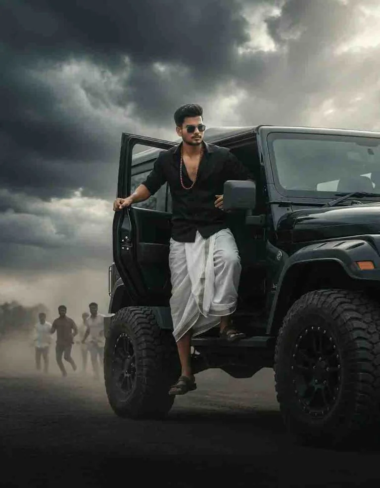 He is wearing a half-sleeve black shirt, with sleeves rolled up and the chest slightly unbuttoned, revealing a beaded chain around his neck. His lower attire is a traditional crisp white veshti/dhoti with a shiny silver border, folded in a rugged and stylish manner, emphasizing strength, confidence, and boldness. His arm rests naturally on the jeep as he steps in, creating a dynamic and authoritative pose.