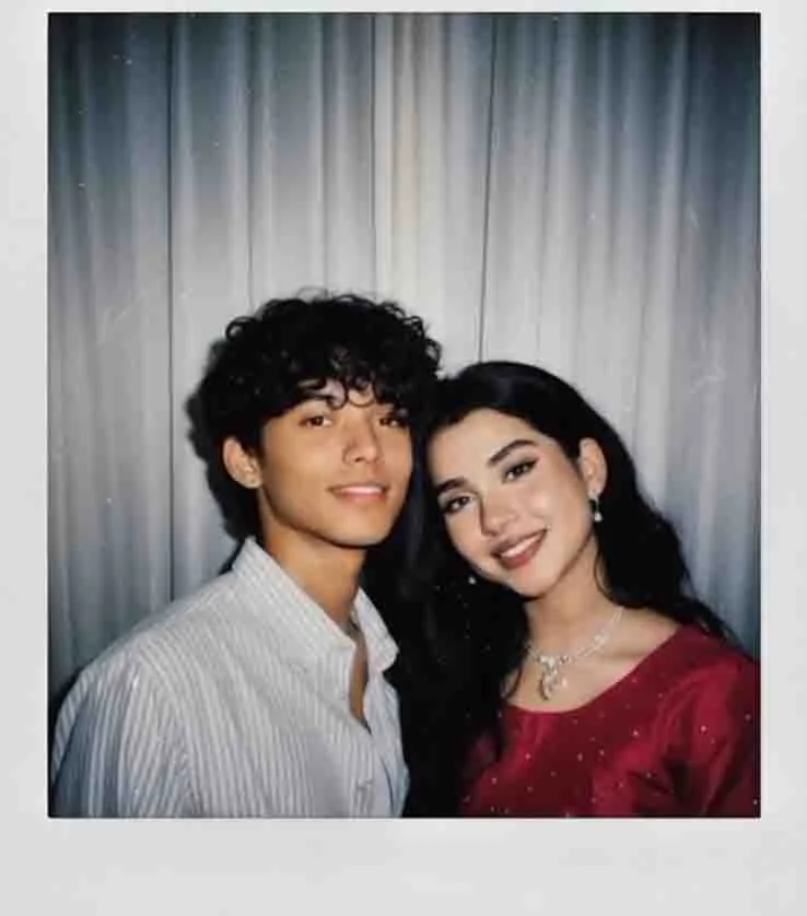 Position the boy and the girl in a cute, natural pose, such as standing close together or sharing a light moment, radiating charm and simplicity. The overall image should capture a cozy, heartfelt vibe, evoking the nostalgia of a vintage Polaroid memory — genuine, emotional, and beautifully imperfect.