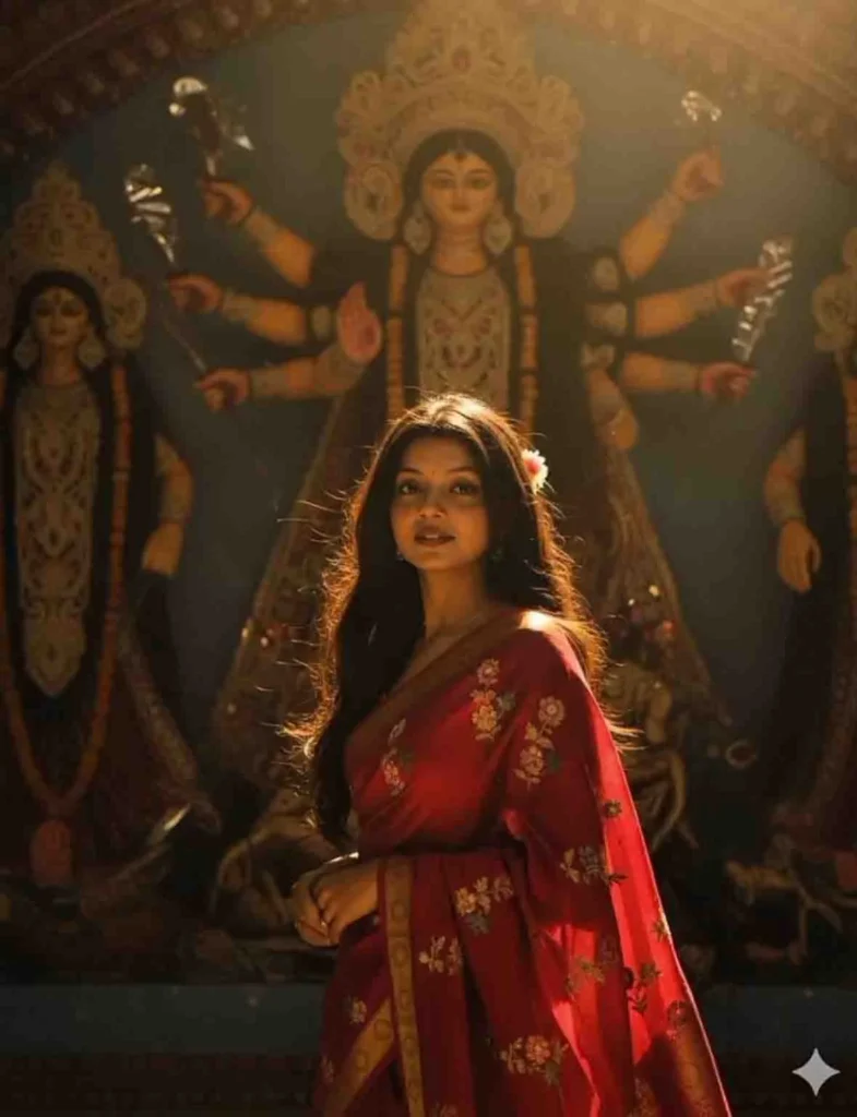 The background should feature the looming shadows of Durga Puja idols, creating depth, mystery, and divine contrast. The idols’ presence should feel symbolic — protective yet distant — blending devotion with artistry. The lighting should be dramatic and high-contrast, mixing warm golden tones with soft shadows to capture a mystical, nostalgic atmosphere. The overall aesthetic should carry a retro film grain, a touch of raw texture, and emotional realism, making the scene look like a still from an old romantic masterpiece — both artistic and emotionally captivating.