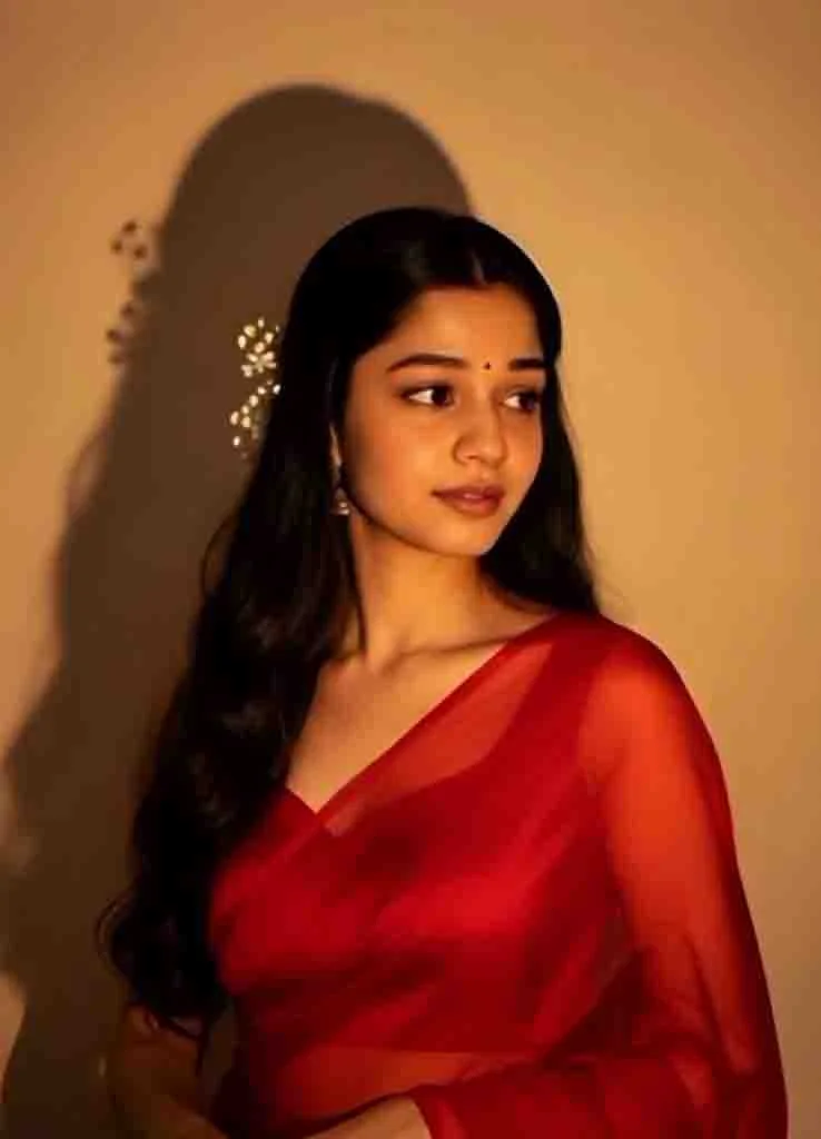 She is draped in a perfect crimson saree with delicate floral embroidery, styled in a Pinterest-inspired retro aesthetic. The saree pleats should flow gracefully in the wind, giving a sense of motion and elegance, while enhancing her bold red-baddie charm that reflects the allure of old Bollywood divas. A small, delicate flower tucked visibly into her hair adds a subtle feminine touch and enhances her timeless beauty.