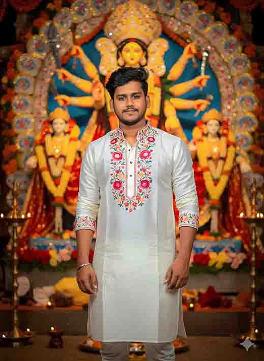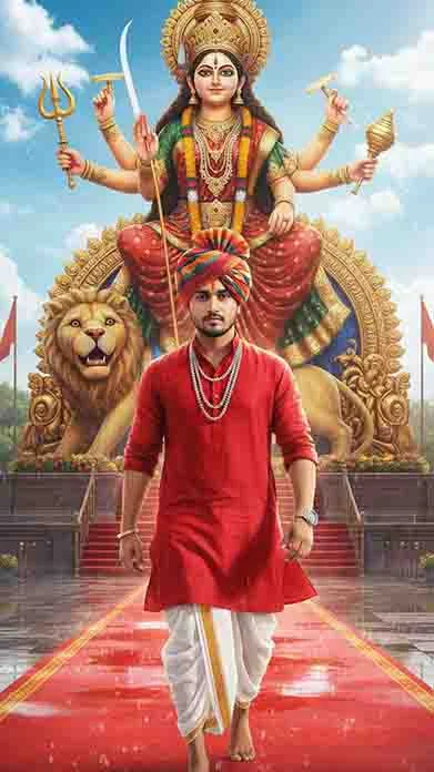 Add layered chains and a shining wristwatch to accentuate his powerful, charismatic personality, making him the focal point of the composition. Behind him, prominently feature the uploaded statue of Durga Devi in a grand, magnificent, and awe-inspiring form, enhancing the festive and spiritual aura of the scene.