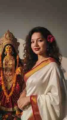 In the background, showcase a grand Goddess Durga idol adorned with fresh flowers, traditional lamps, and softly glowing lights, enhancing the festive, spiritual, and cultural ambiance of the scene. Ensure the image captures the intricate textures of fabrics, floral decorations, and lighting, creating a high-definition, cinematic-quality artwork that is both realistic and visually captivating.