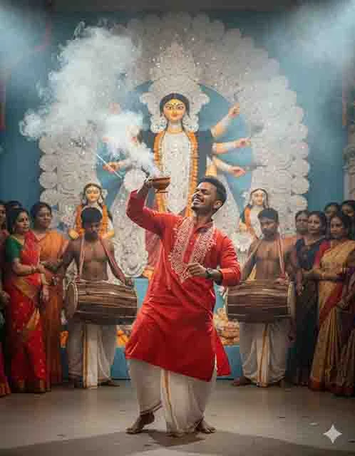 Transform this picture into a beautiful, cinematic image of me dancing joyfully while wearing a traditional red and white kurta with a white dhoti, keeping the hairstyle exactly as in the original picture. I am holding a dhunuchi, with smoke gracefully rising from it, adding a dynamic and festive effect. The scene is set in front of a Sabeki-style Durga idol, beautifully adorned in Sholar Saaj, evoking a classic Bengali Pujo atmosphere.